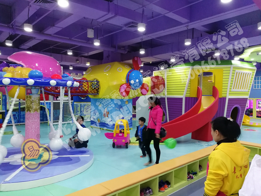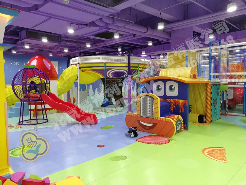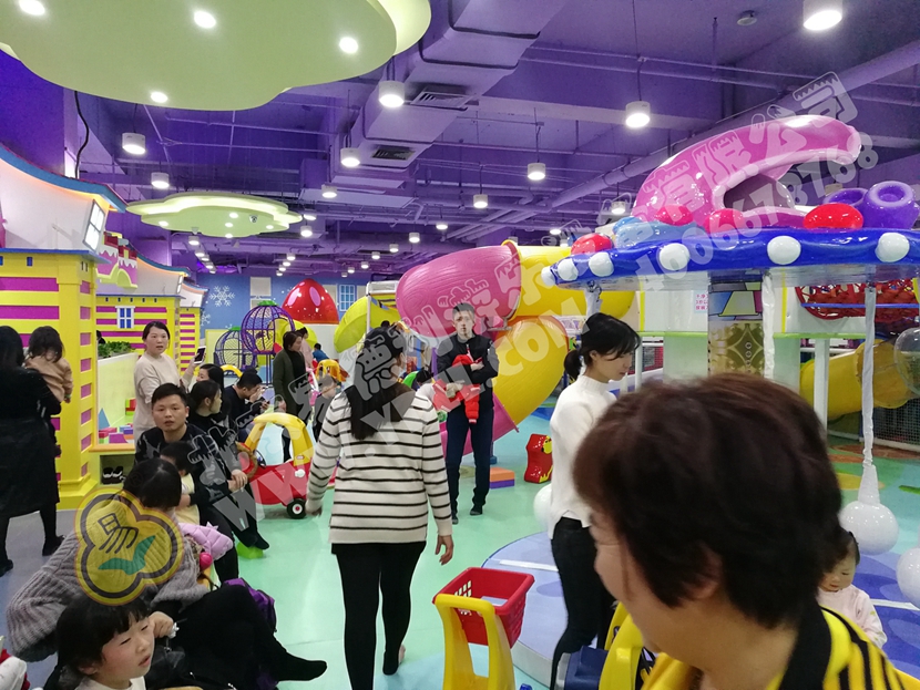 這是園內的明星區(qū)域“童童夢夢歷險記”超酷主題區(qū)。里面布置有積木類、淘氣堡、繩網類、運動蹦床、騎乘小車等各類游樂設備。而從現(xiàn)場觀察所得,這里也是人氣最鼎盛的一個區(qū)域,很多小孩子都在這個區(qū)域久久停留,不肯離去;家長們也紛紛入內,與孩子們親密互動,好一片溫馨的親子氛圍。