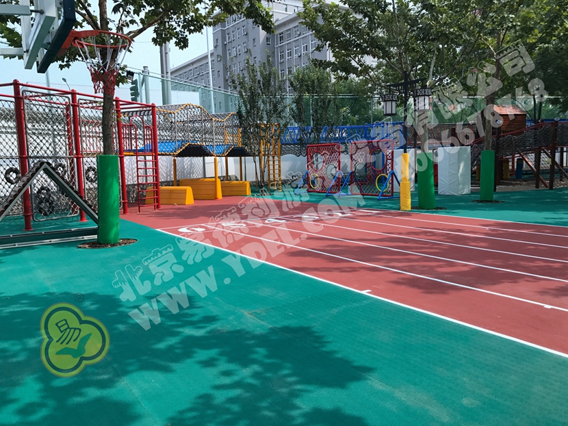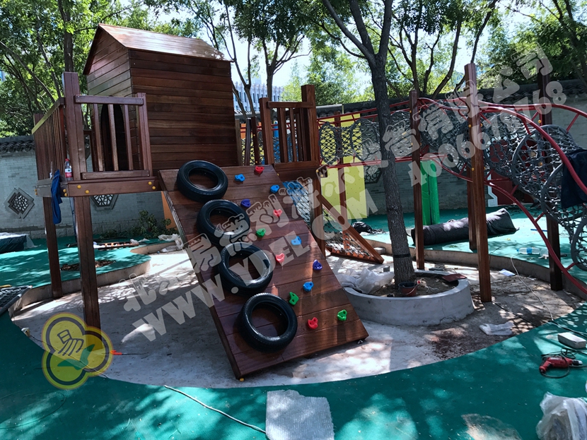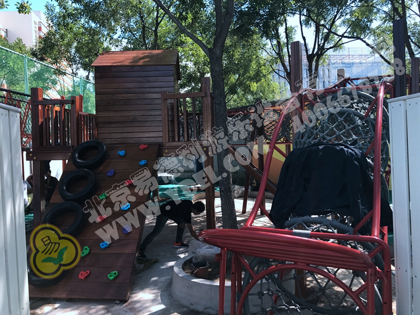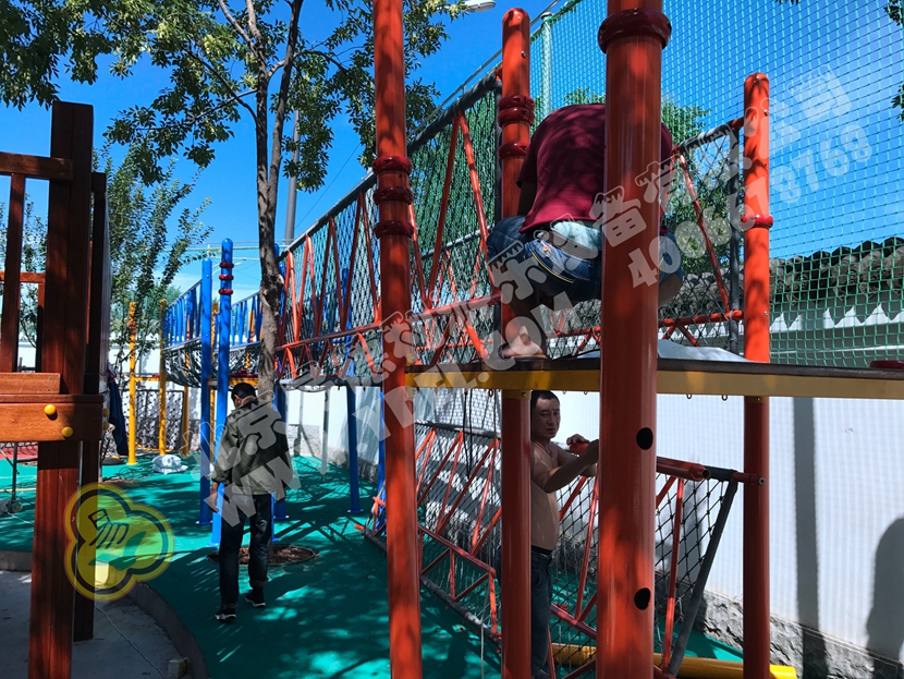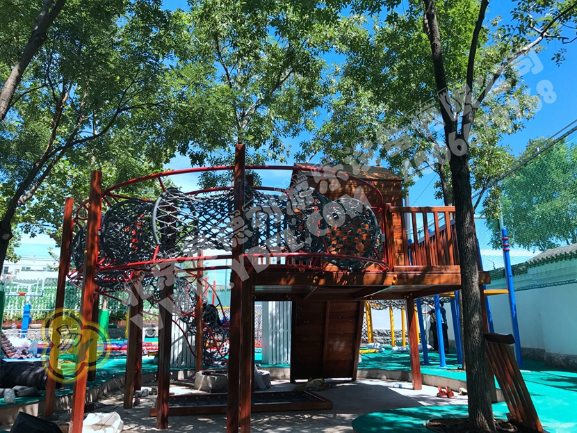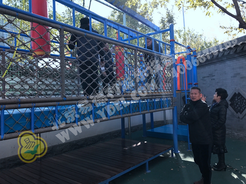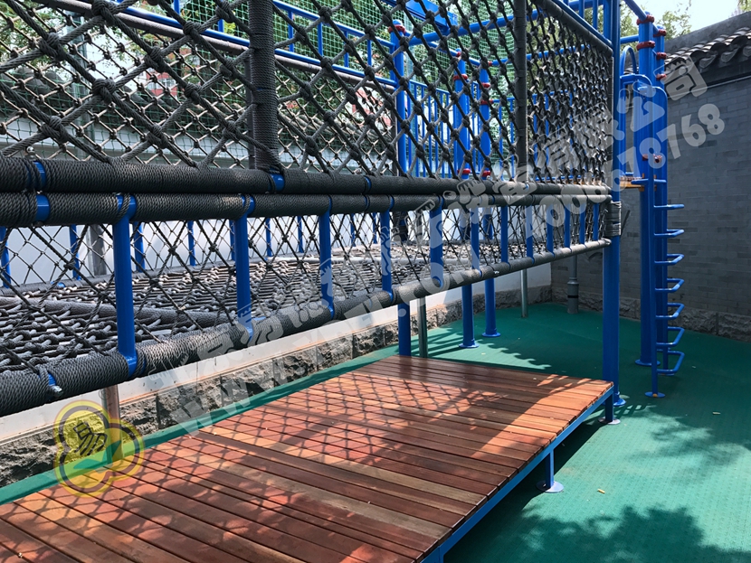 北京西城小學(xué)游樂(lè)設(shè)備拓展訓(xùn)練、戶外闖關(guān)、繩網(wǎng)攀爬、網(wǎng)龍、木制組合滑梯等組成的一套多功能兒童體能訓(xùn)練組合、兼?zhèn)溆螛?lè)功能。