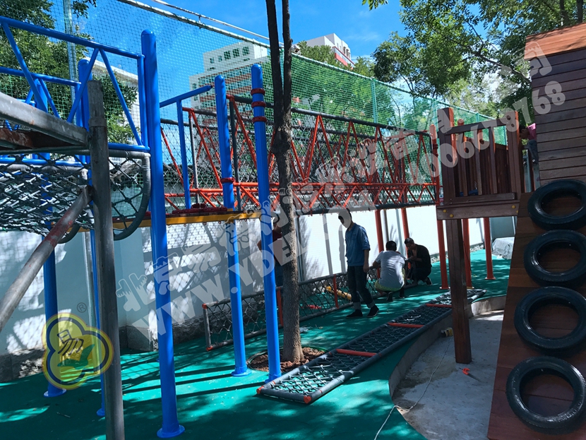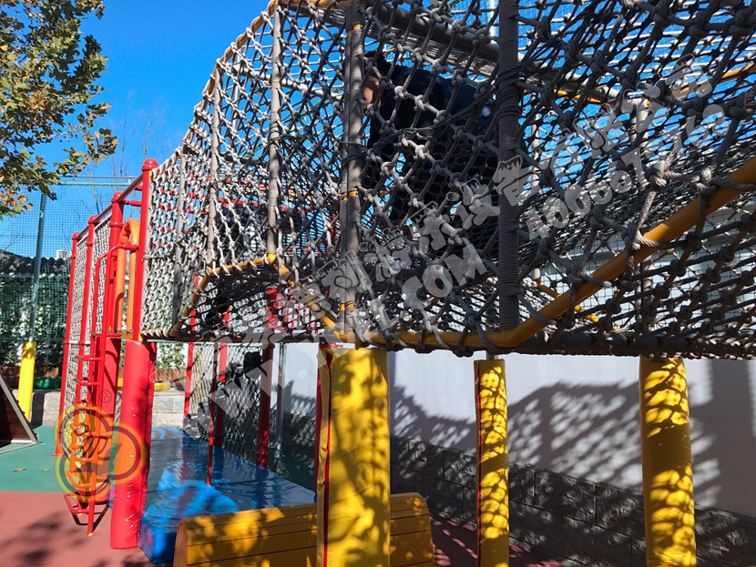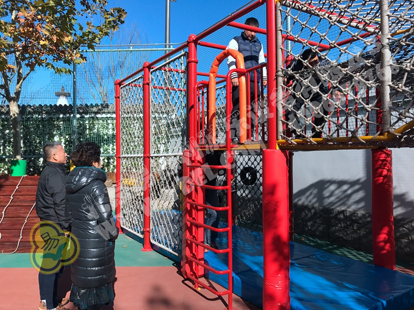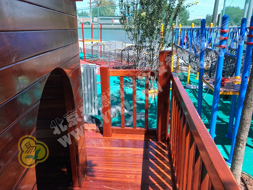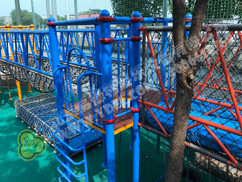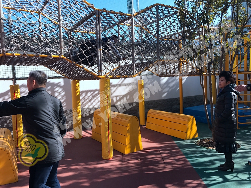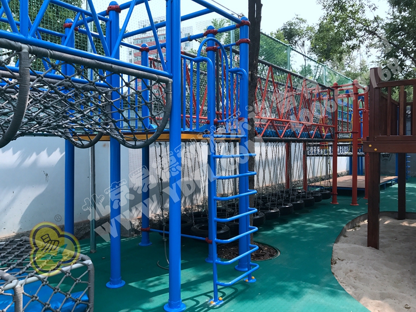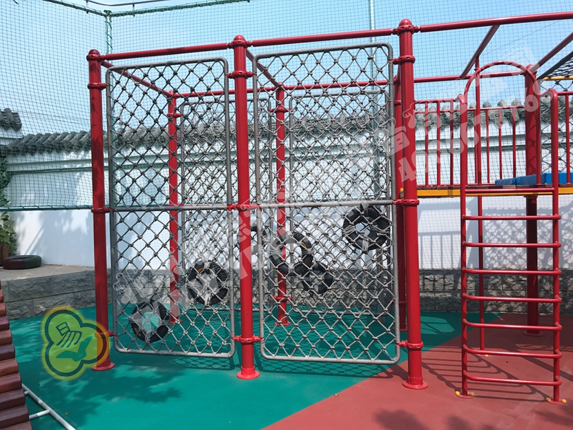 北京西城小學(xué)游樂(lè)設(shè)備拓展訓(xùn)練、戶外闖關(guān)、繩網(wǎng)攀爬、網(wǎng)龍、木制組合滑梯等組成的一套多功能兒童體能訓(xùn)練組合、兼?zhèn)溆螛?lè)功能。