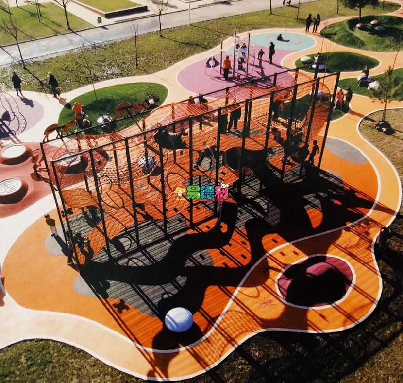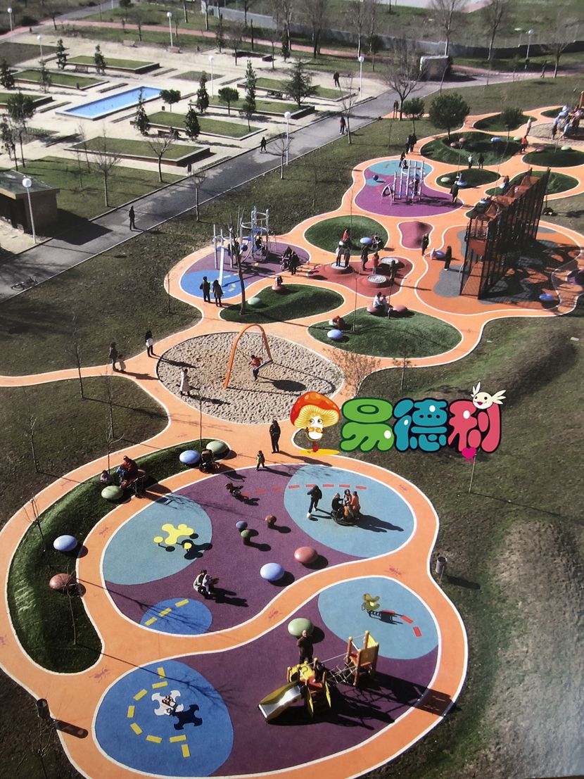 在這個(gè)項(xiàng)目中,場(chǎng)地的布局規(guī)劃主題是蟻塚。因此,平面圖再現(xiàn)了螞蟻這些昆蟲制造的各種道。可愈有道在游樂場(chǎng)各處都以不同形式呈現(xiàn)螞蟻的形象;在人行道上有螞蟻的繪畫,用于指示路線; 游樂場(chǎng)設(shè)施的形狀,以及整個(gè)游樂場(chǎng)都是螞蟻的輪廓。為了區(qū)分游樂場(chǎng)各個(gè)區(qū)域,鋪設(shè)的材料以及選取的顏色不盡相同。連接著各個(gè)游樂區(qū)域的曲道是由橙色的瀝青鋪設(shè)而成; 中間差不多400 平方米的空隙部分鋪上人工草皮,創(chuàng)造11個(gè)小的波浪起伏的綠色山丘。兩個(gè)圓形部分用石英砂鋪上,周邊則用不同顏色的橡膠鋪設(shè): 紫色配上深藍(lán),或紅色配上灰色和黃色。平坦的游戲區(qū)域和火山口形狀的表面,地形的曲線完美地與兒童在玩耍時(shí)的移動(dòng)呼應(yīng)。