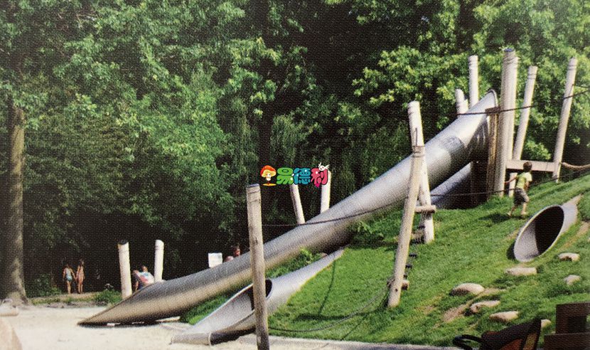 一個人工的小山丘融入了兩種完全不同的游樂設施: 其中一邊是一個草地斜坡,配有滑梯、隧道和其他冒險游樂設施; 而在另外一邊,卻是一