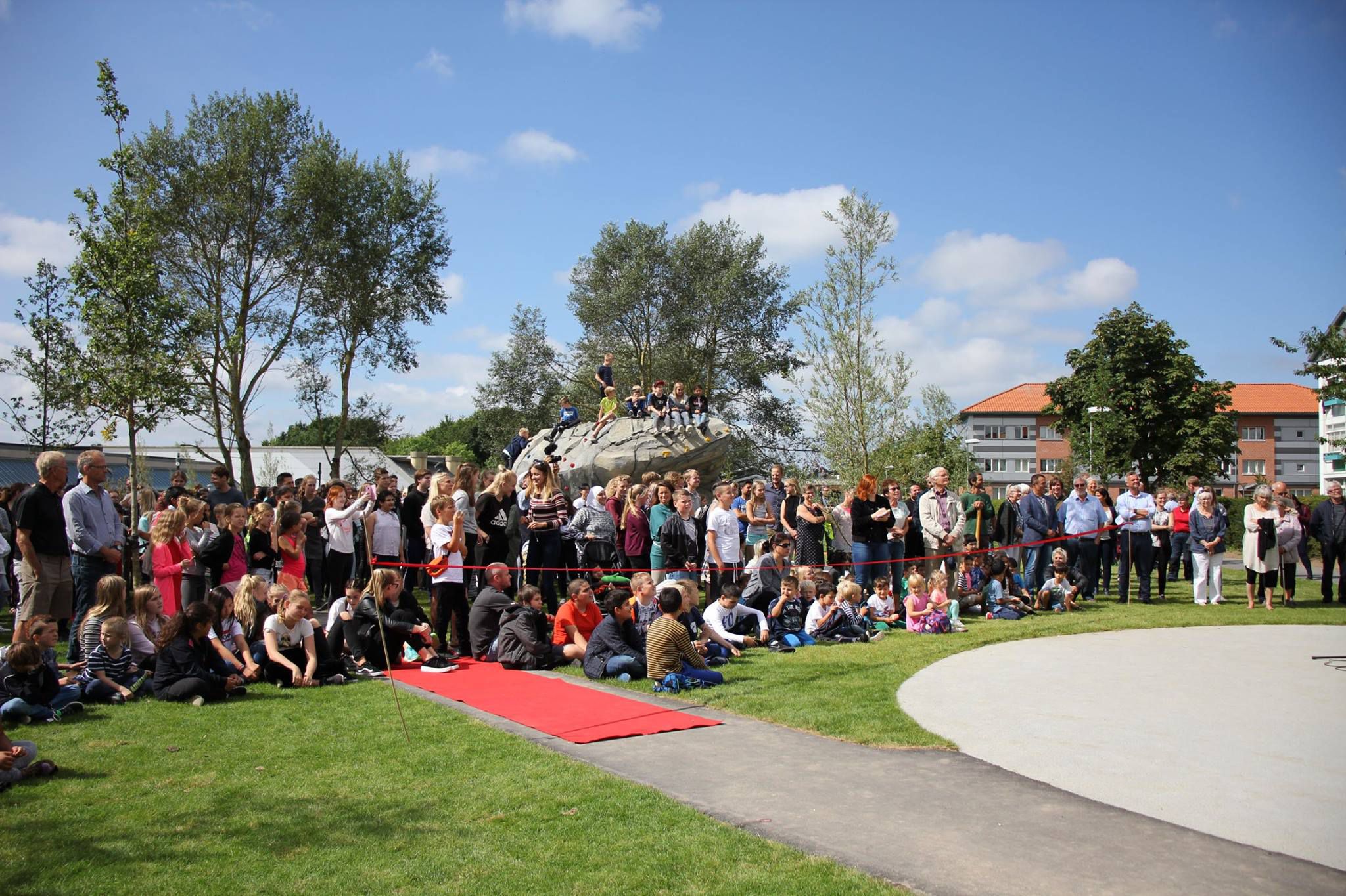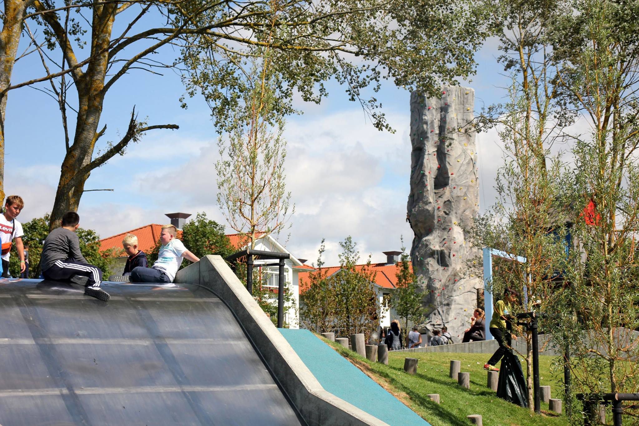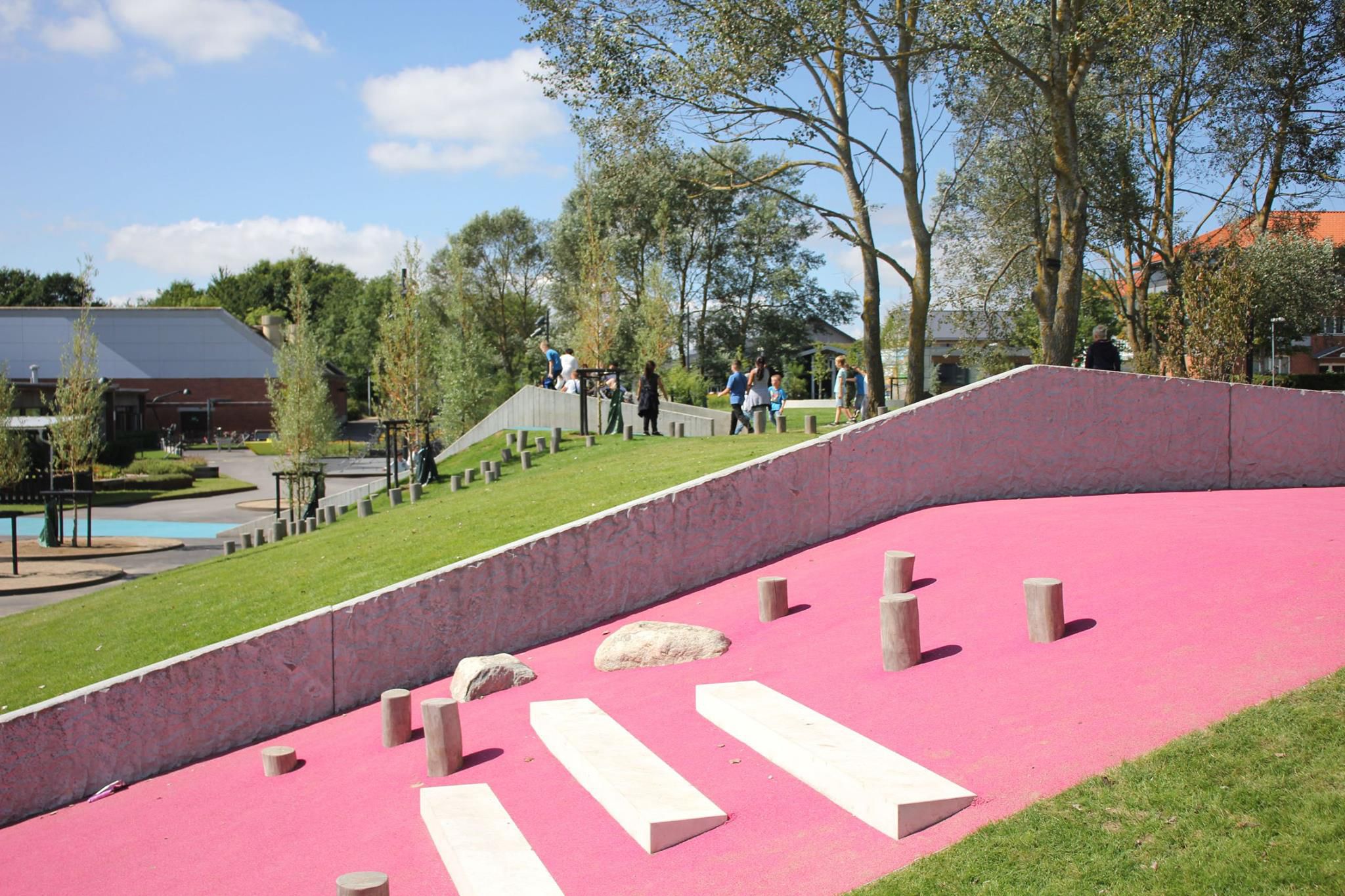 Skolegården er tænkt som et epicenter for ophold og aktivitet, hvor gårdens farvede flader skærer sig på tværs af parkstrøget, hvori forskellige opholds- og aktivitetsrum opstår. Udenfor skolegården, på kanten af parkstrøget, er der opsat et stort udendørs klatremiljø, heriblandt et 15 meter højt klatretårn.
